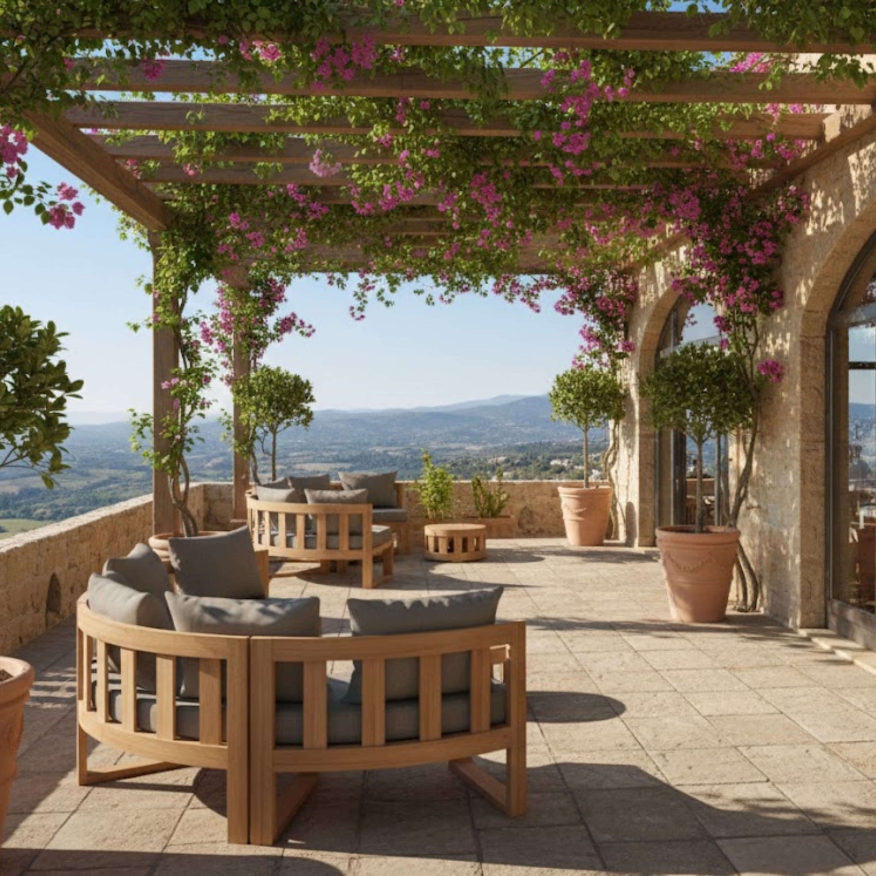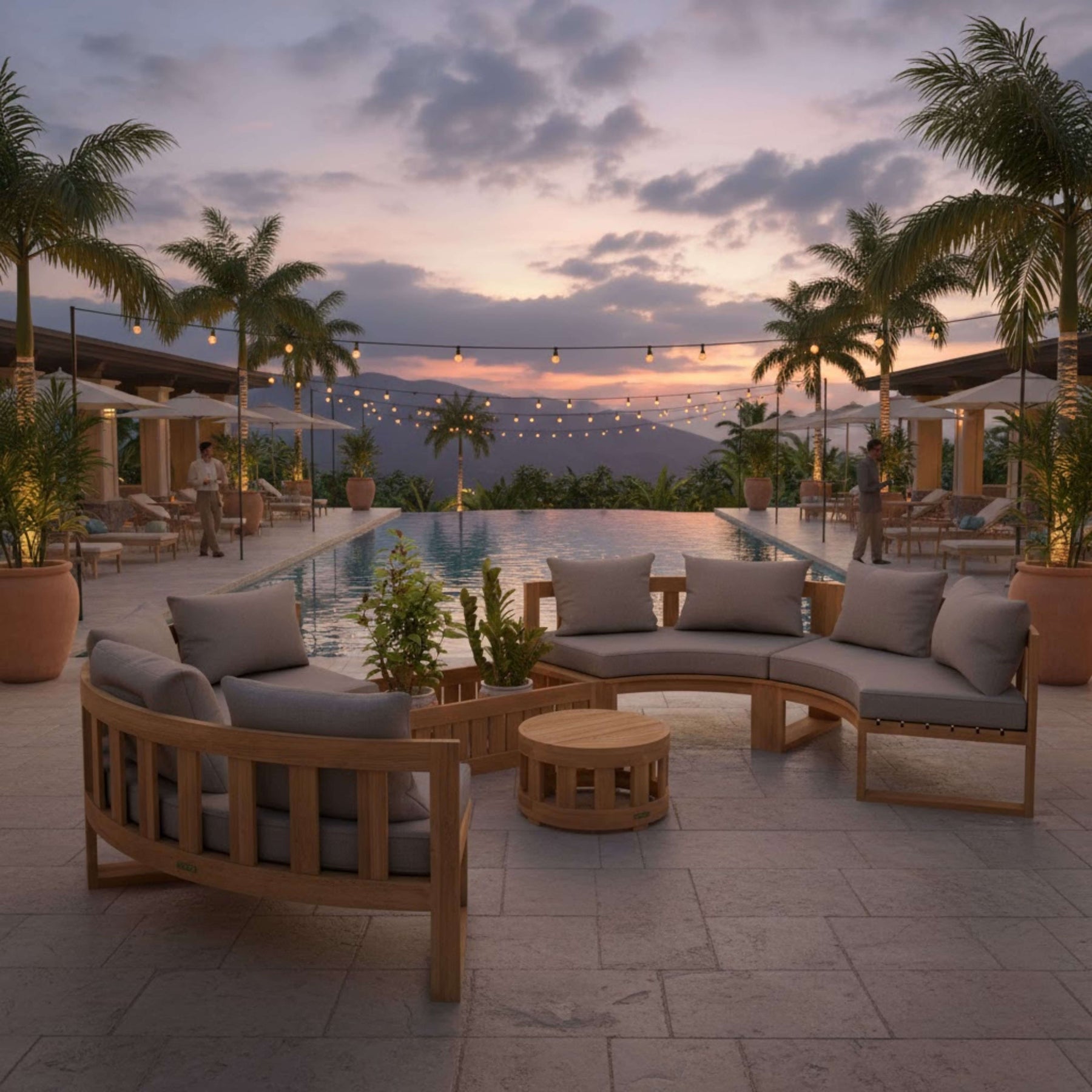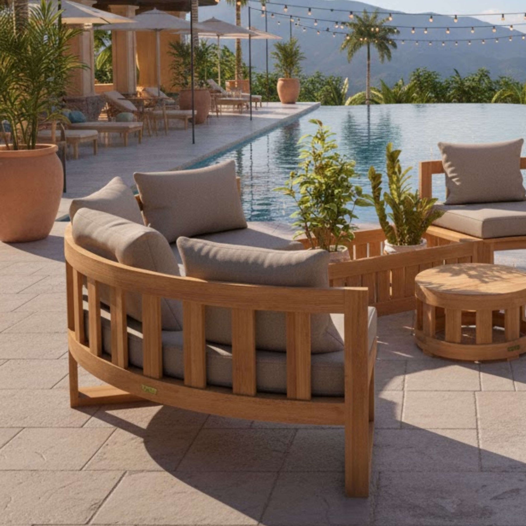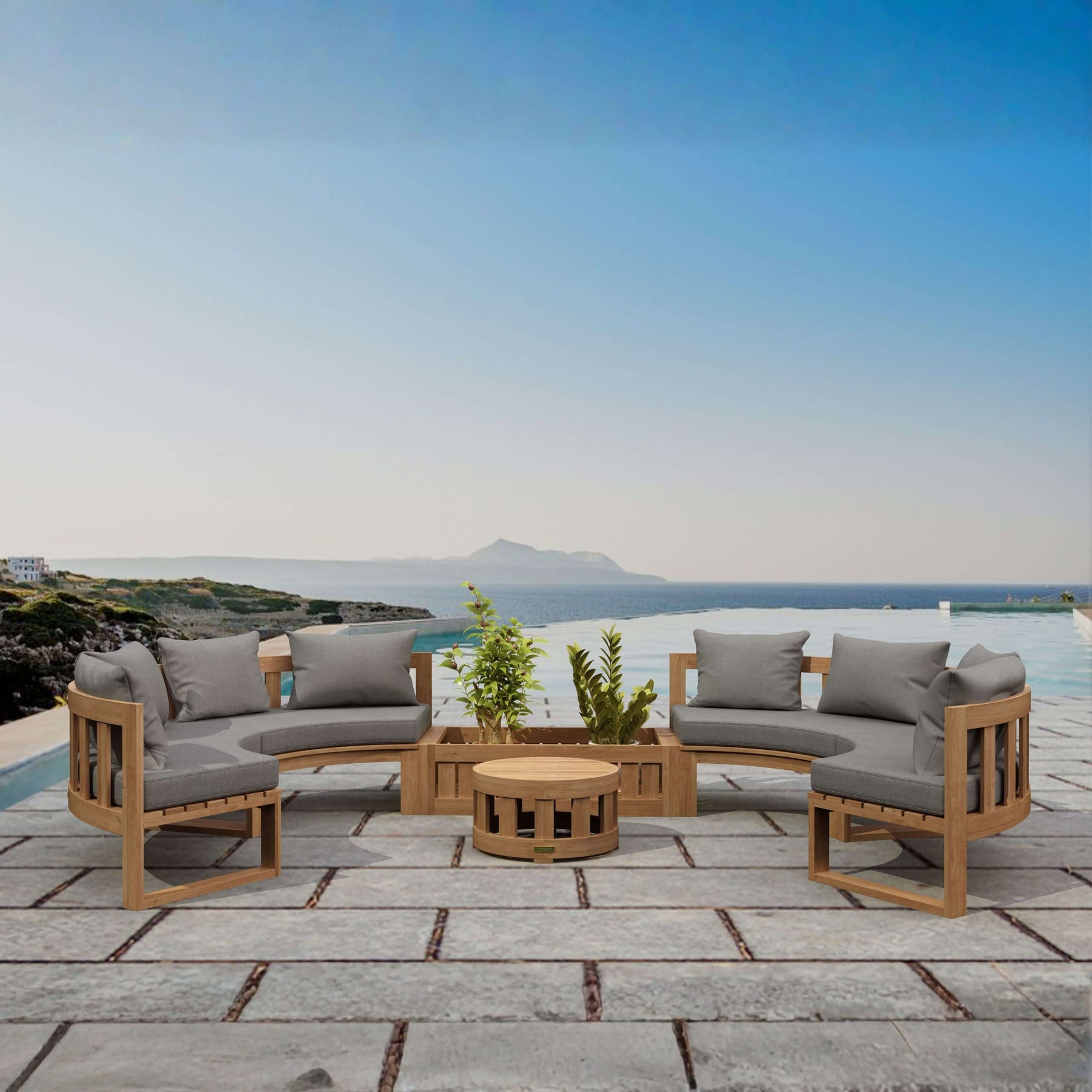Sturdy and designed for public and commercial use, this Circular Modular Set is also suitable for personal home use for the yard and outdoors. Featuring four circular benches that seats two, one straight planter and a circular coffee table, this collection is made of premium unfinished teak that’s sanded smooth for a natural clean finish. Add additional pieces from the collection such as the circular planter, the straight bench, or the straight side table, which can all be placed on the middle or the edges of the set. Mix and Match different layouts such as a “c” shape, as “s” shape with seats facing each other, or a fully circular layout. The possibilities are endless the choice yours. Includes 5” thick seating cushions and pillows from All-Weather Sunbrella fabrics with your color choice.