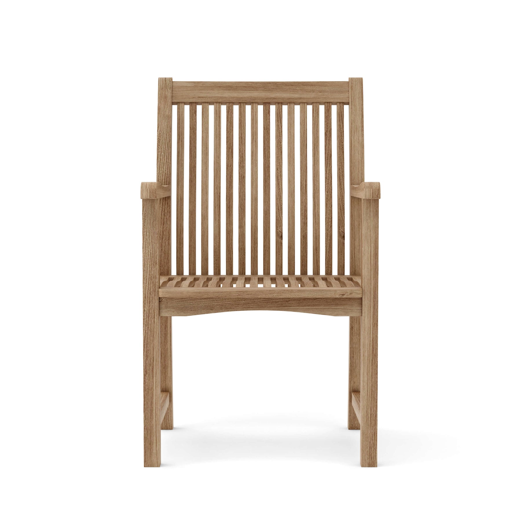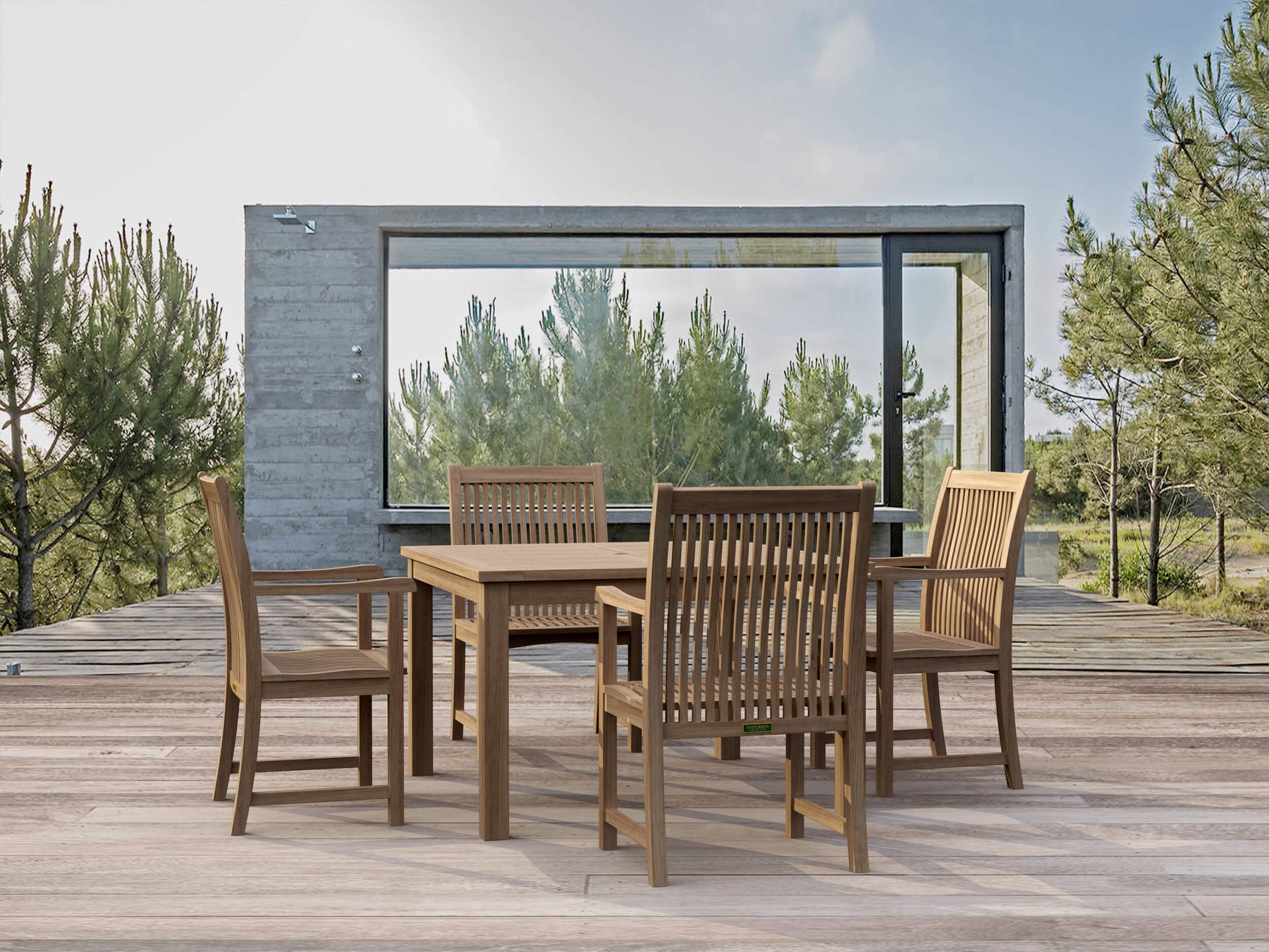 A spacious and durable teak outdoor dining set for the patio or yard, this set includes a Windsor 47” Square Table and four Chicago Dining Armchairs. Made of solid teak wood, the Windsor 47” Square Dining Table is a bulky and quality sized table that’s durable and stable; while the Chicago Dining Armchair is designed with teak slats that contour and curve on the back and seat for a comfortable sitting experience. The perfect table set for outdoor dining or a game of cards, guests will be amazed by its quality built frame and size as well as the smoothness and touch of the authentic teak wood. Table includes an umbrella hole with brass plug when not in use.