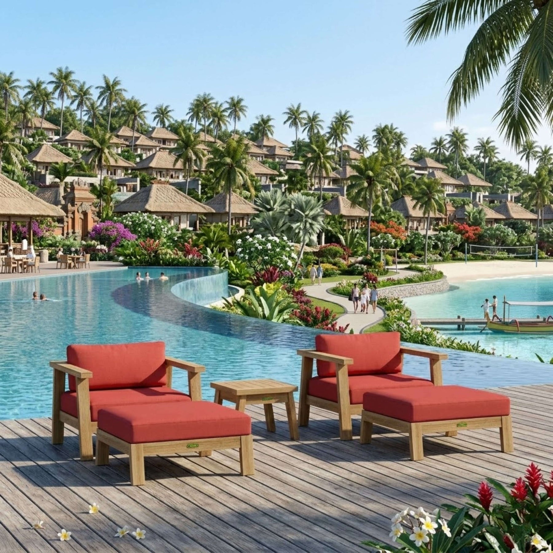 Rest your weary legs and relax in deep seating comfort with this 5-Piece Palermo Set. Comfortable, stylish and quality-built, it’s made from premium grade teak that’s unfinished and sanded smooth for a natural smooth finish. The perfect place to spend a relaxing evening lounging, drinking, and chatting with a partner or friend, this 5-Piece Palermo Set includes two Palermo Armchairs, two Palermo Ottomans, and the matching Palermo Square Side Table. Includes 6” All-Weather Sunbrella Cushions with color options.