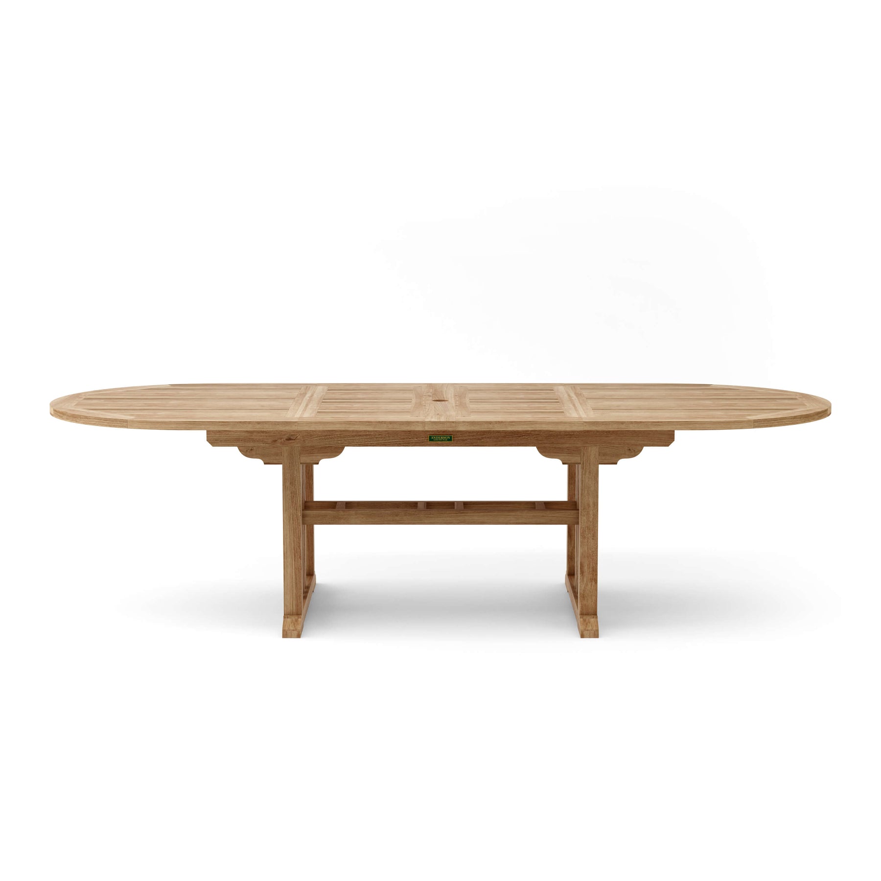 This solid teak “Sahara Oval Double Extension Table” makes the perfect addition to your patio or yard. The unique built-in butterfly pop-up leaf enables you to open and close your table in less than 15 seconds. The leaf folds away for easy storage under the table when not in use. The table stands 29″ high and is 43″ wide by 74″ long, reaching up to 106″ in length when fully extended. The table can be extended with 1 or 2 leaves, depending on the length you choose and seats 10 to 12 people comfortably. Includes umbrella hole in center with brass plug when not in use.