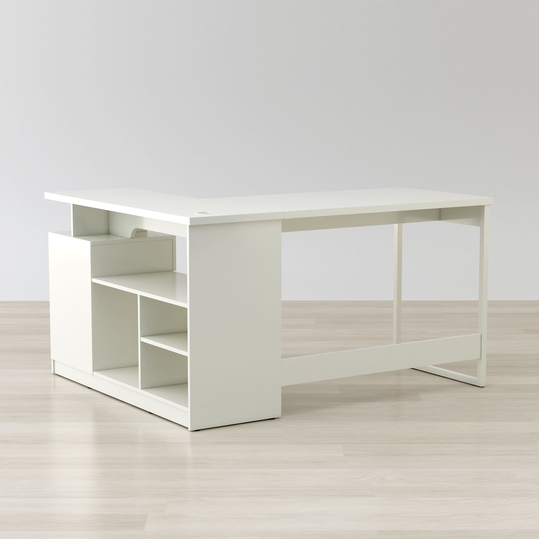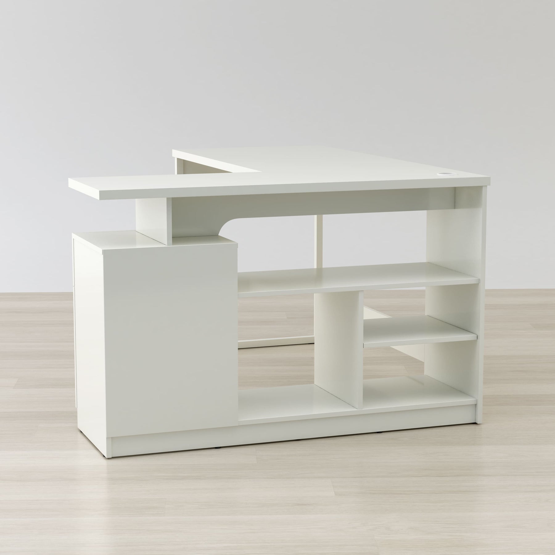 A modern contemporary corner desk sleek and stylish, it’s also spacious and practical perfect for the home or office. Comfortably place office equipment as computers, phones, printers and scanners while seamlessly running any wires or cables through the grommet hole. With five storage areas and a metal glide drawer, easily organize your most important items for easy access. Made of metal legs and engineered wood, it’s finished in a luminous gloss white PVC laminate, a water resistant material.